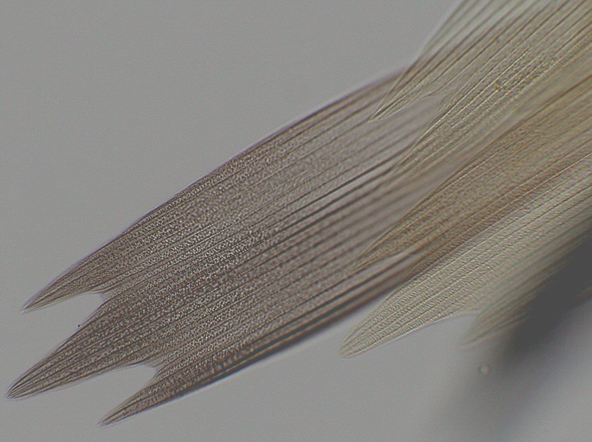 下はかなり鱗粉がはがれ落ちた部分で何枚か刺さっている部分を撮った。