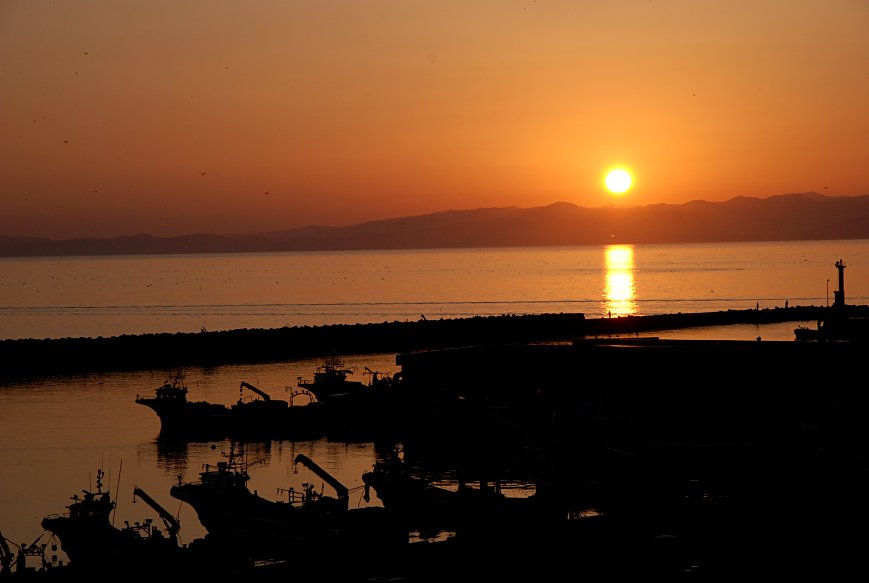 虻田を過ぎた頃、ふと噴火湾の方を見ると夕陽がとても綺麗。