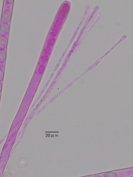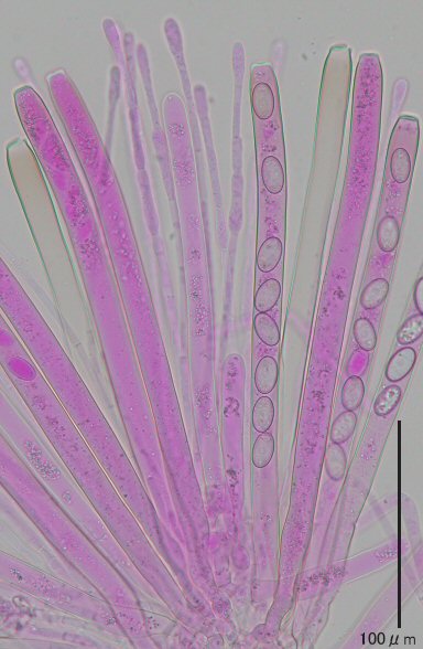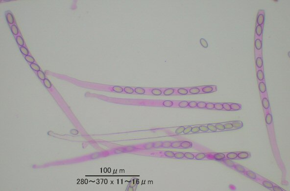 子嚢のサイズは(スイスの菌類図鑑)、235-280×11-12μm.1+.