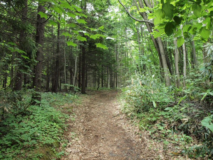 遊歩道をはさんで右に広葉樹林、左に針葉樹、