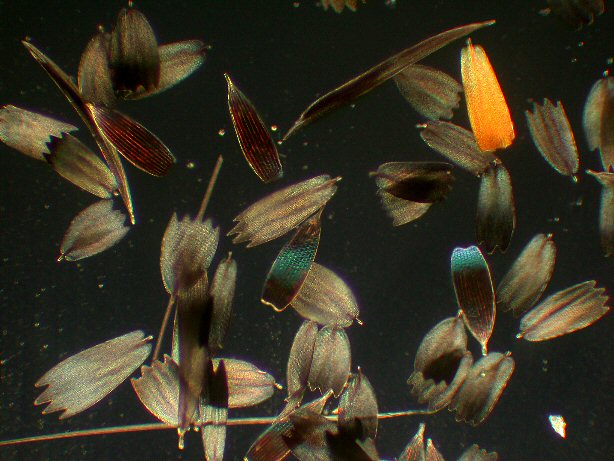 下はかなり鱗粉がはがれ落ちた部分で何枚か刺さっている部分を撮った。