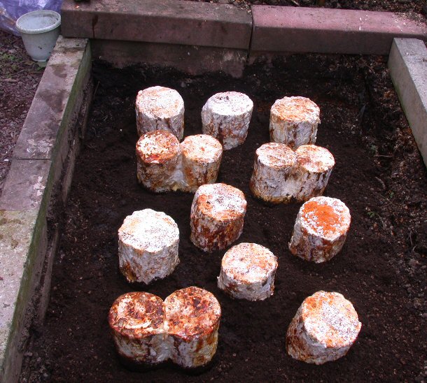 マイタケのホダ木を袋から出し、並べた。