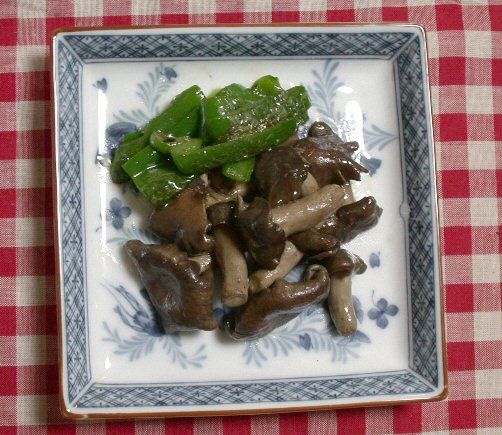 フライパンからシャカシメジを取り出し、ピーマンを炒め添えた。