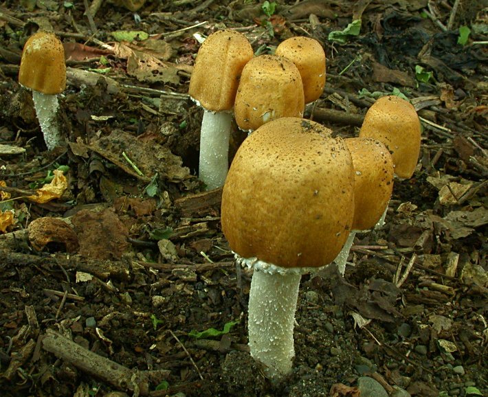 Gregarius vel caespitulus, edulis. Pileo 8-18 cm. lato, subgloboso, dein convexo vel subumbonato, demum subplano , sicco, ochraceo, furfuraceo; carne albida vel flavidula, non mutabili, cressa; odore saporeque nullo; lamellis liberis, albidis, dein roseis, demum atro-purpureis, confertis; stipite 10-18 cm. Longo, 10-25 mm. crasso, subaequali, deorsum leviter incrassato,albo vel albido, sericeo, e farcto cavo; annulo membranaceo, ampro, subtus flavo-furfuraceo, suprro; sporis in cumulo atrobrunneis, ellipsoideis, levibus, 6.5-8×4-5μ.